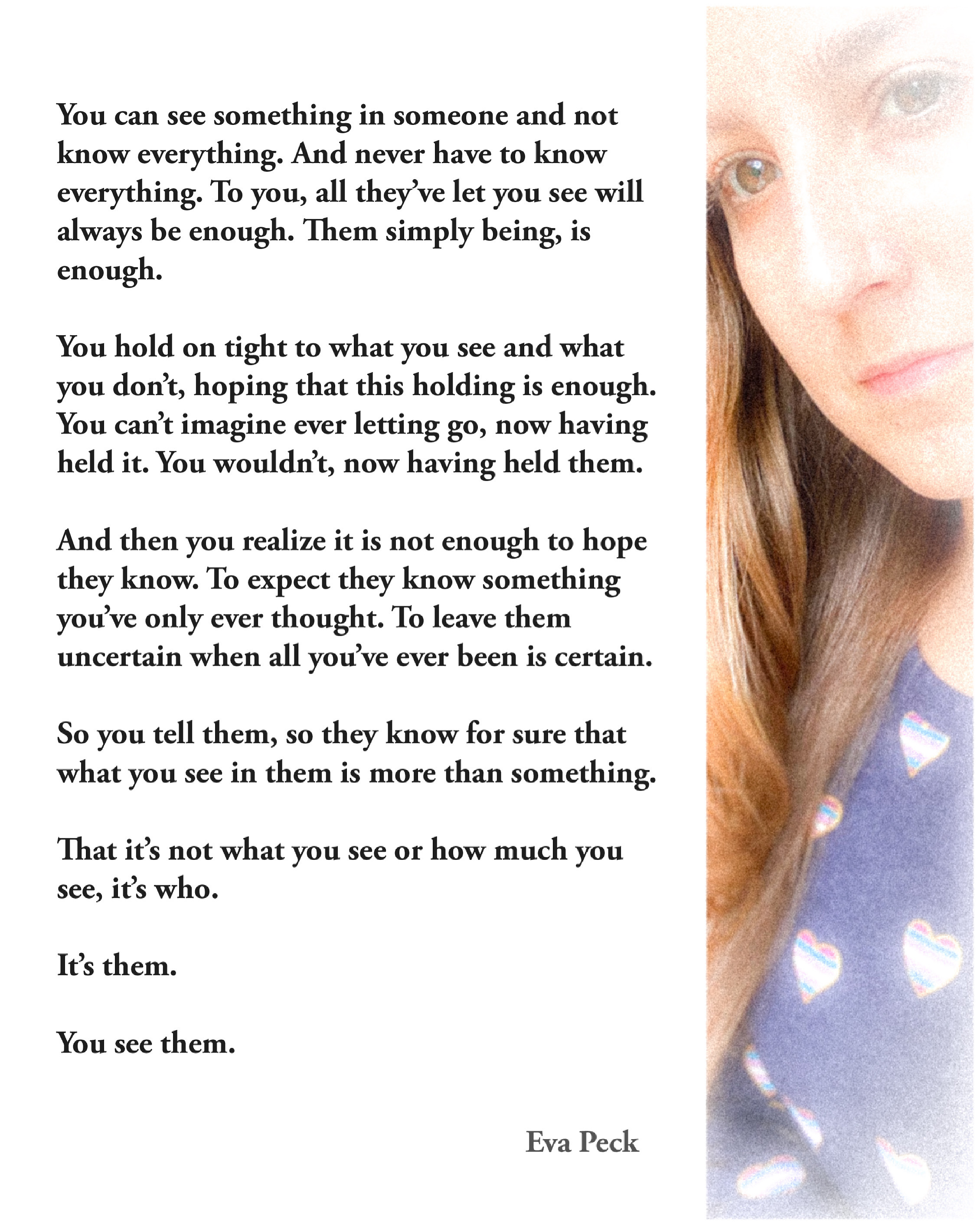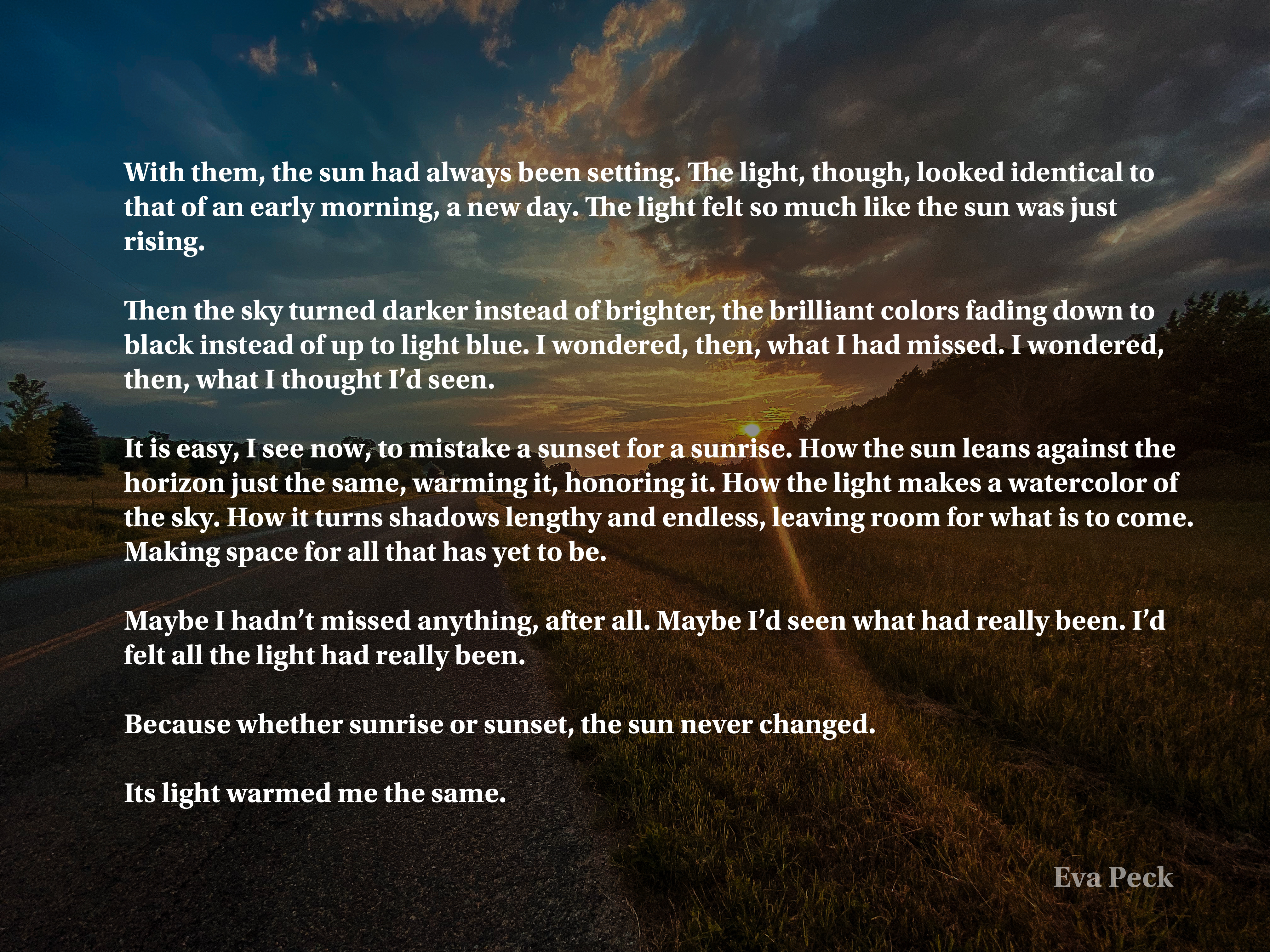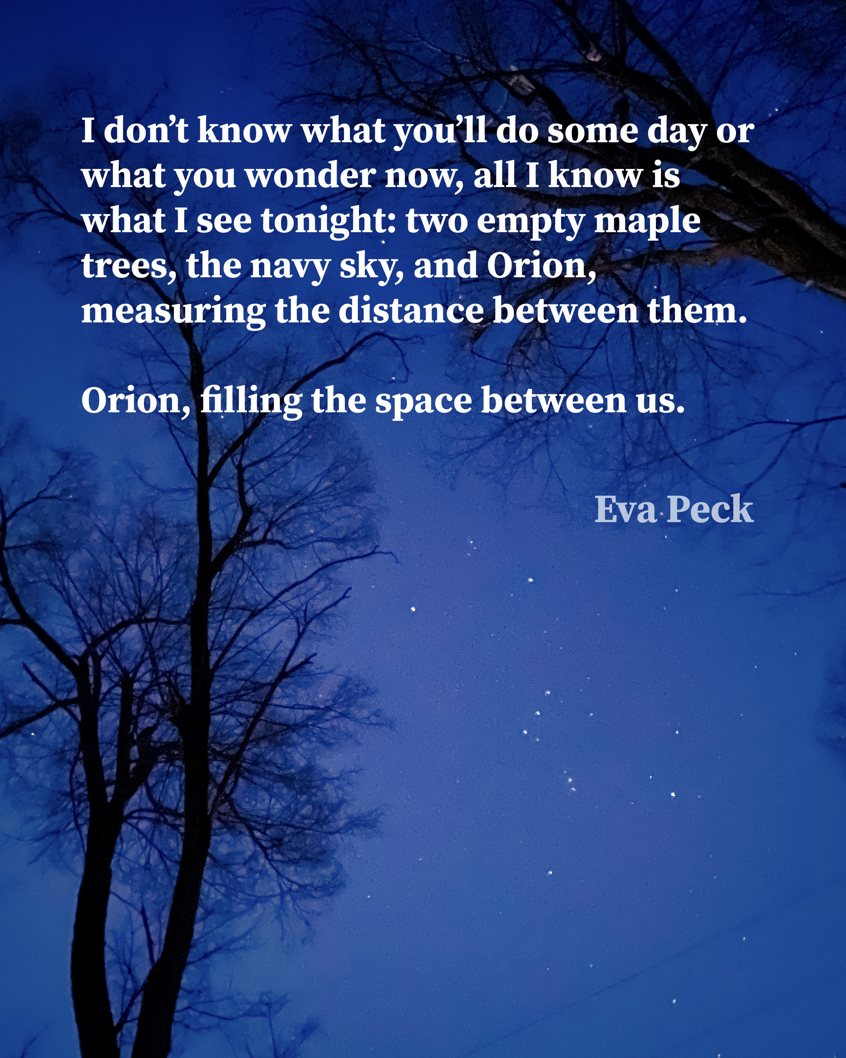 Sometimes, it takes many things to make meaning of it. For example, if someone were to somehow darken the whole sky except for a single star, it’d be almost impossible to know which way the rest of the sky was tilted. Looking back was a little like that. I didn’t have a single moment that I knew. I didn’t have a date from a journal entry or a grand realization one afternoon when it’d all become clear. Instead, I had a million little moments and memories and feelings, and I needed all of them to see the whole sparkling constellation.